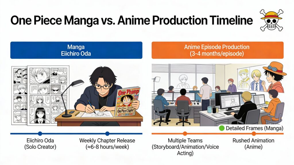 Lo crucial aquí es que un capítulo de manga se publica completamente terminado. No hay procesamiento posterior, no hay equipos adicionales puliendo detalles. Oda y su pequeño equipo de asistentes trabajan directamente bajo deadline semanales (que posteriormente se han flexibilizado con descansos periódicos). Este modelo de producción, aunque aparentemente más rápido que el anime, mantiene un control de calidad arquitectónico: cada viñeta está deliberadamente compuesta, cada línea sirve a un propósito narrativo o visual.